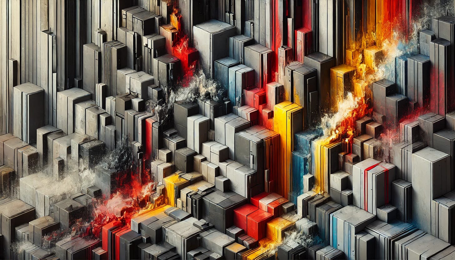 - If the blocks are eroded, worn down, it implies struggle—something resisting change but being slowly overtaken by it. It suggests time, endurance, the way history grinds away at structures until they are reshaped by the forces around them. This might give a sense of tension, of the battle between the static and the fluid, before one ultimately gives way.
