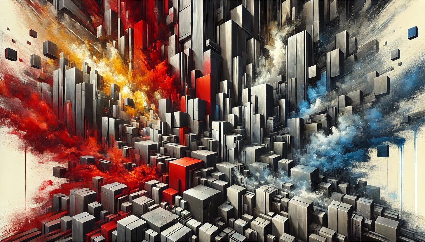 Here’s the refined version with more variation in the block sizes—some large and dominant, others small and nearly lost—alongside a more intense, unpredictable flow of color. This version should heighten the contrast between control and chaos, making the piece even more dynamic and thought-provoking.