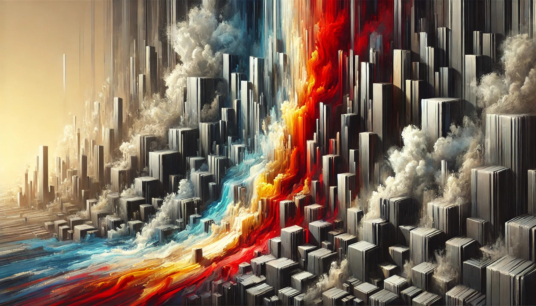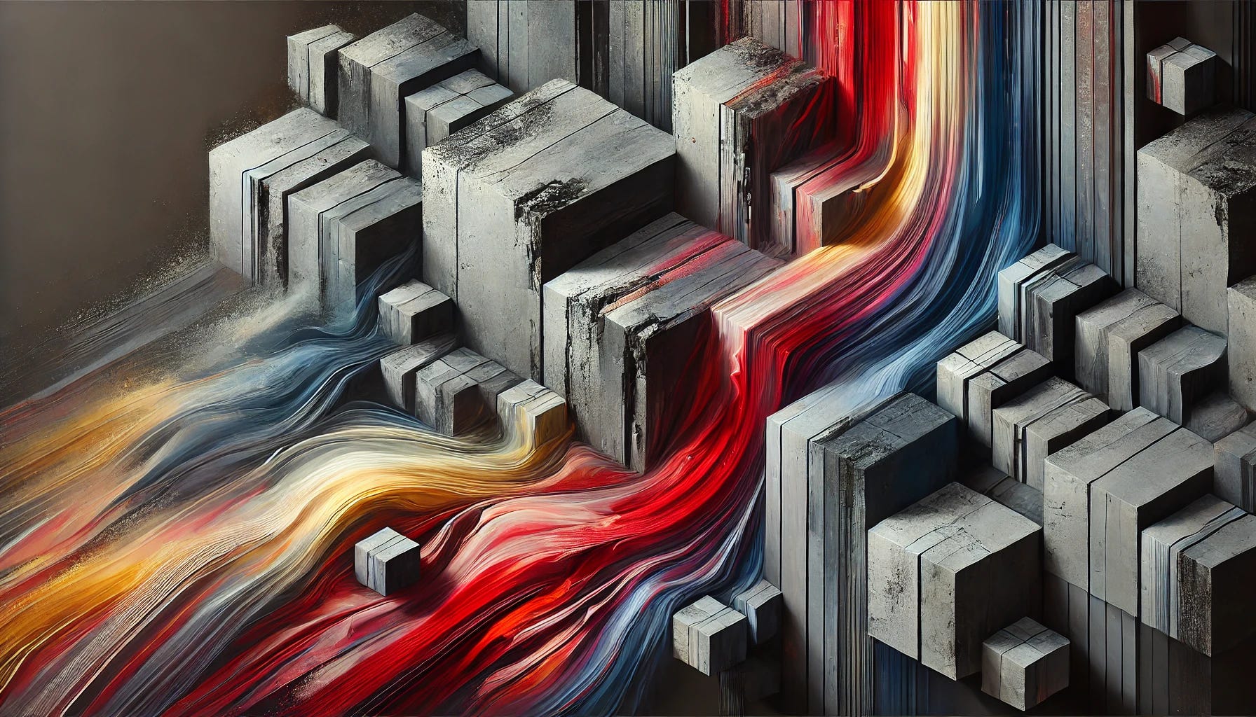 - If the blocks are eroded, worn down, it implies struggle—something resisting change but being slowly overtaken by it. It suggests time, endurance, the way history grinds away at structures until they are reshaped by the forces around them. This might give a sense of tension, of the battle between the static and the fluid, before one ultimately gives way.